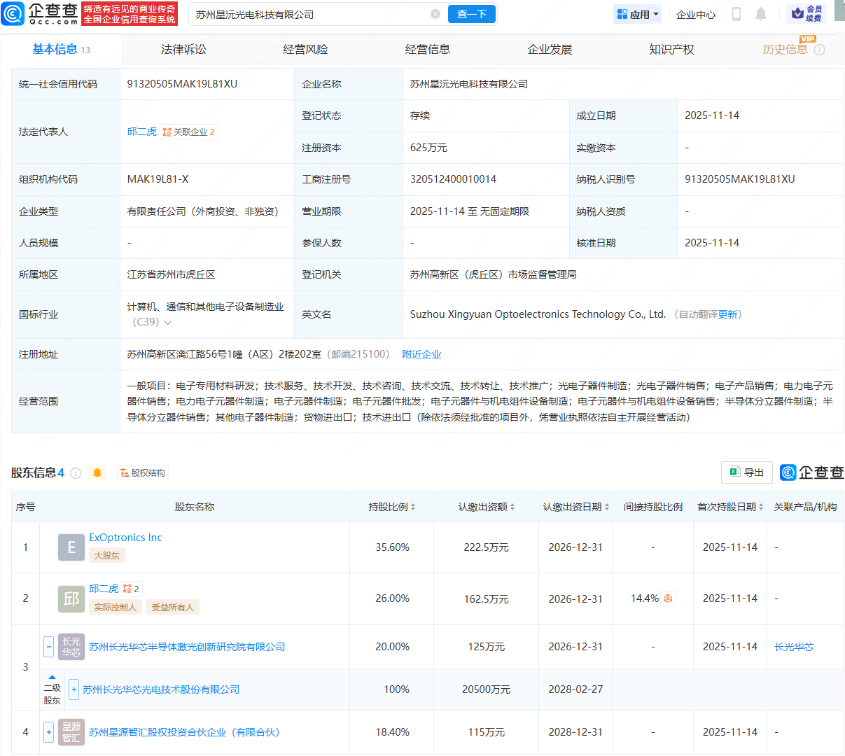 近日,苏州星沅光电科技有限公司成立,法定代表人为邱二虎,经营范围包含:电子专用材料研发;光电子器件制造;电力电子元器件销售;电子元器件制造;半导体分立器件制造等。企查查股权穿透显示顺配宝,该公司由ExOptronicsInc、长光华芯(688048)全资子公司苏州长光华芯半导体激光创新研究院有限公司等共同持股。