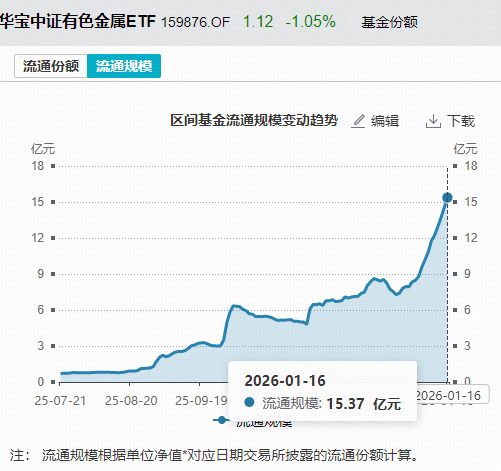 数据显示,截至1月16日,有色ETF华宝(159876)最新规模15.37亿元,创历史新高。在全市场3只跟踪中证有色金属指数的ETF中,是规模最大的ETF。