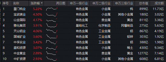 成份股方面,厦门钨业领涨超5%,宝武镁业、山金国际、天山铝业涨逾4%壹资网,雅化集团、国城矿业、中孚实业、盛和资源等个股跟涨。权重股方面,北方稀土涨超2%,山东黄金涨逾1%。