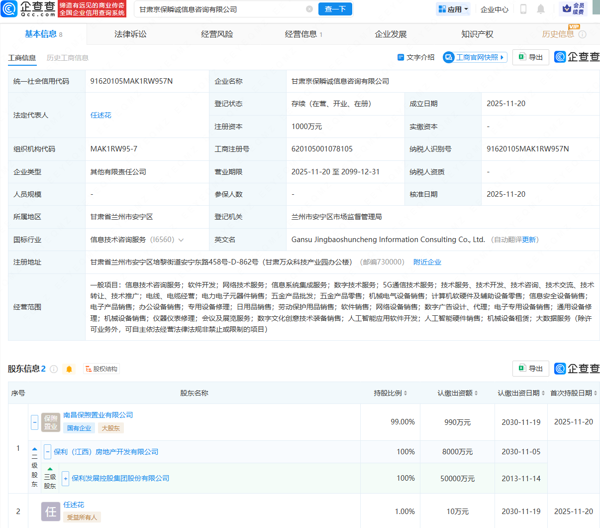 近日,甘肃京保瞬诚信息咨询有限公司成立,法定代表人为任述花,注册资本为1000万元,经营范围包含:数字技术服务;5G通信技术服务;电线、电缆经营;电力电子元器件销售;人工智能应用软件开发等。企查查股权穿透显示沪深策略,该公司由保利发展(600048)旗下南昌保煦置业有限公司、任述花共同持股。