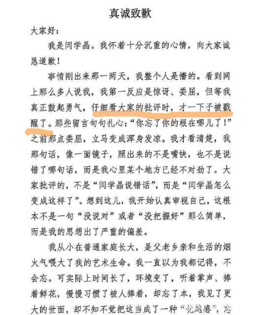 1:事情发生之后,第一反应是惊讶与委屈,但真正鼓起勇气看大家评论的时候,一下子就把自己给戳醒了。立马就认识到了自己的错误所在。2:说错了话,不是没有把握好这么简单。闫学晶承认自己的思想出现了严重的偏差。