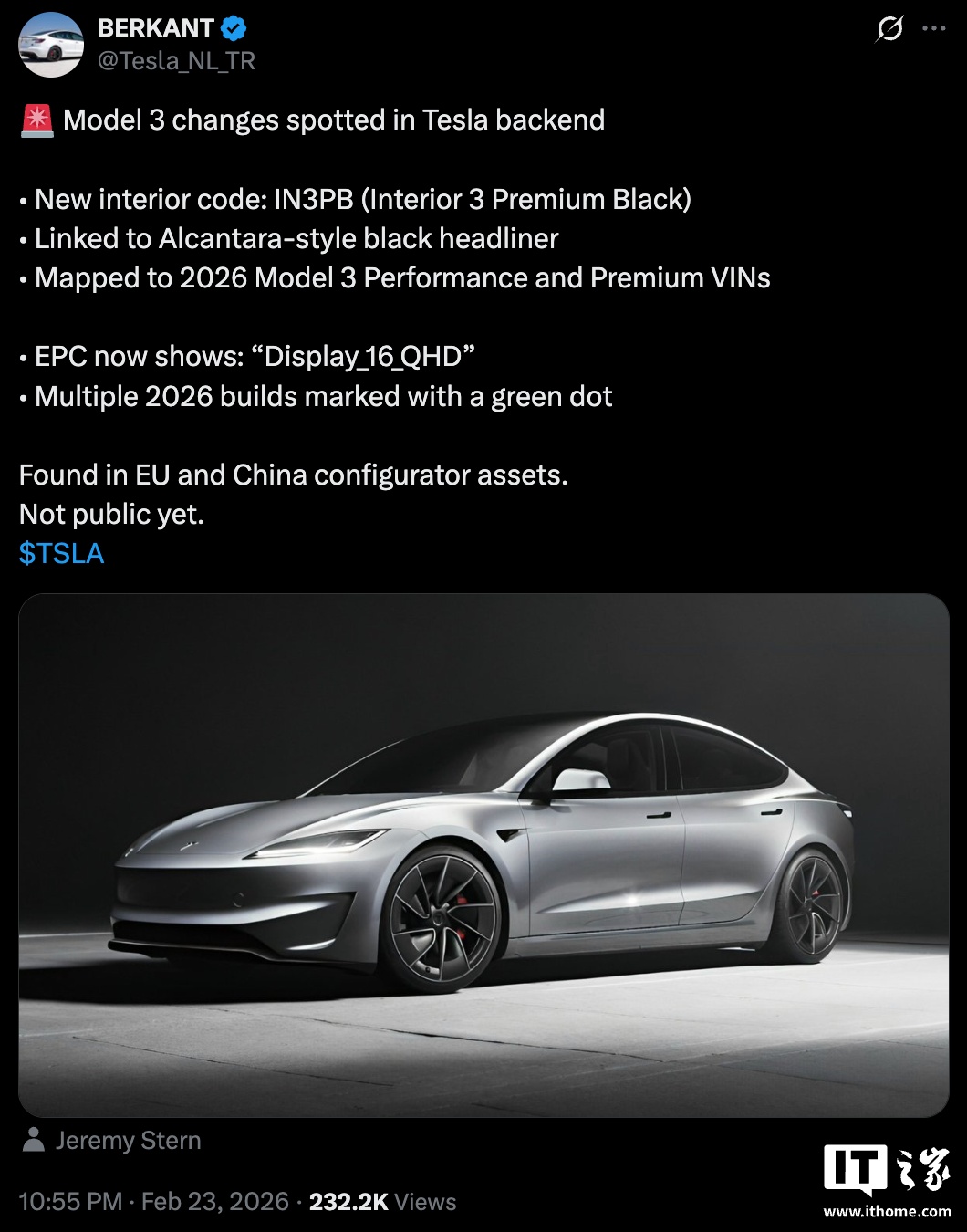 IT之家 2 月 24 日消息,数据挖掘者 BERKANT 在分析特斯拉中国 / 欧洲官网汽车配置器时发现,特斯拉有望为新款 Model 3 Premium 版(海外 Premium 版对应国内标续后驱 / 长续后驱 / 长续全驱)及 Performance 版(Model 3P)引入 2026 款 Model Y 同款 16 英寸 2K 中控屏,同时还将为汽车新增黑色车顶内衬可选。